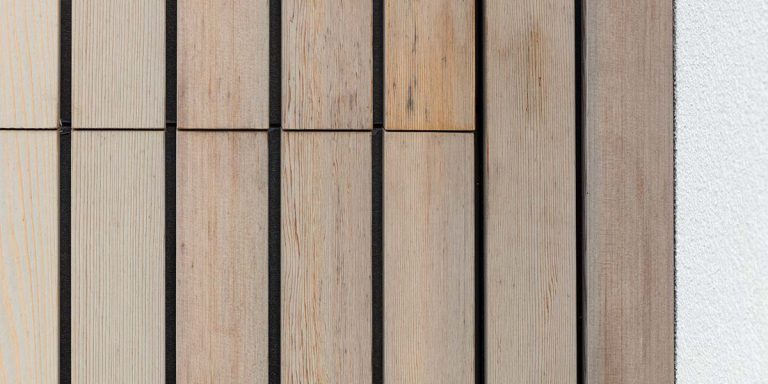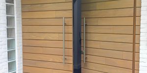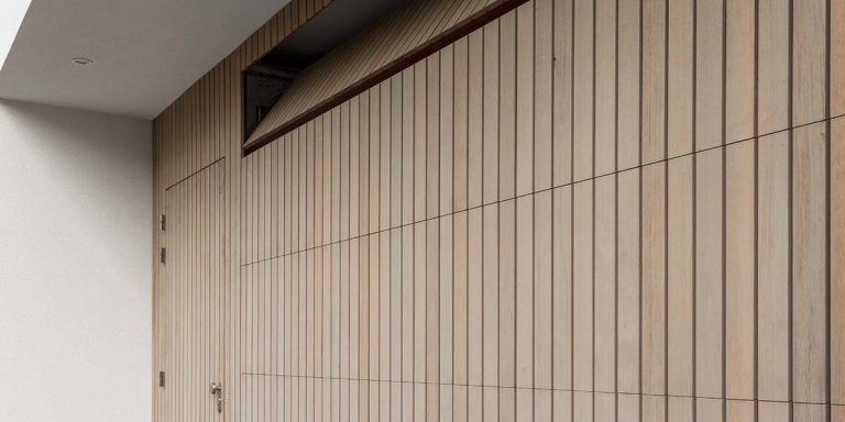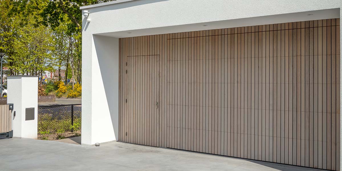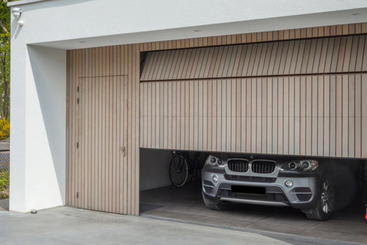 Verticale garagedeur en loopdeur in 1 vlak met de wand Red Cedar latten