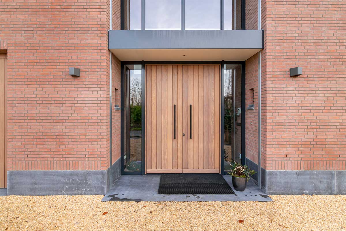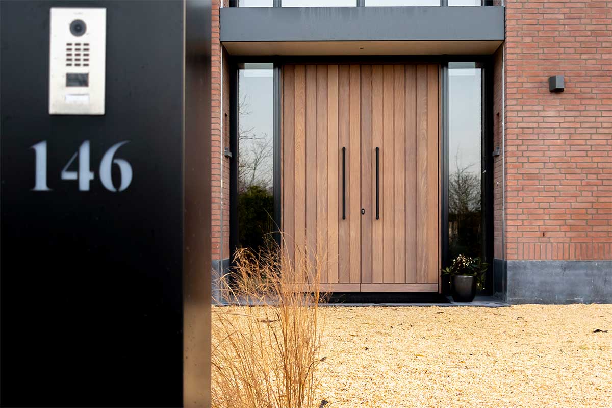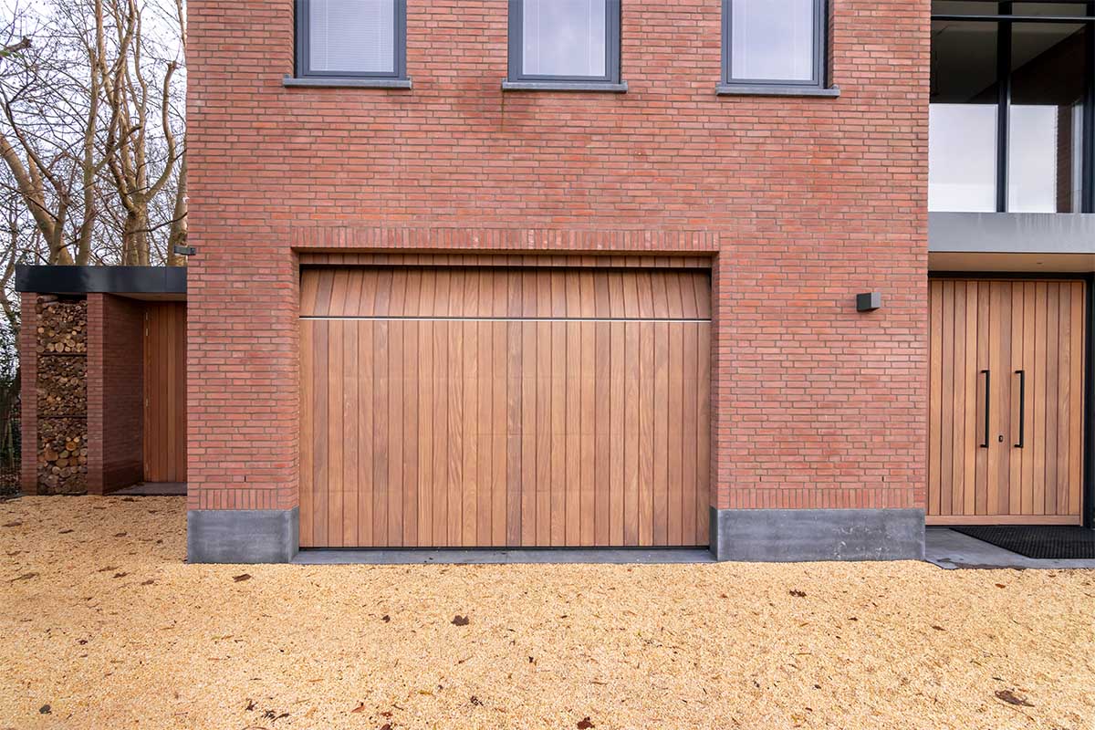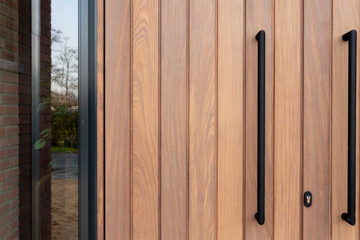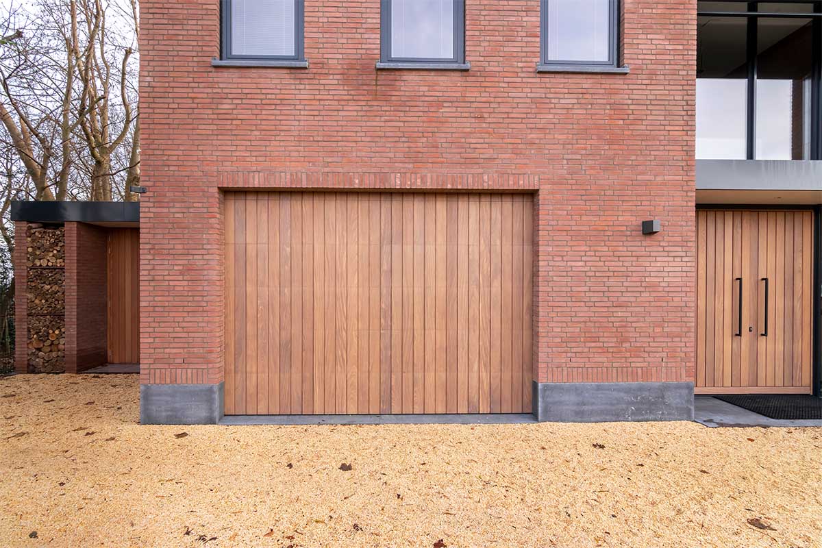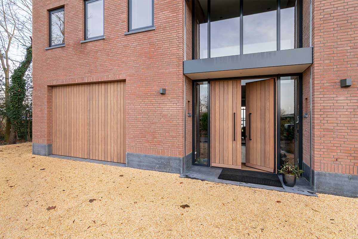 Bij de Vinkeveense plassen heeft Different Doors deze villa mogen voorzien van een houten garagedeur en dubbele houten voordeur in een aluminium kozijn. Beide deuren zijn volledig op maat gemaakt en voorzien van Afrormosia hout. Deze houtsoort kenmerkt zich door de mooie nerfstructuur. Het geeft deze villa een fraaie en natuurlijke afwerking. Daarnaast zijn ze perfect geïsoleerd en veilig. De houten voordeur is voorzien van een zeer veilige driepuntssluiting. De houten sectionaaldeur is te bedienen met een meegeleverde draadloze handzender.