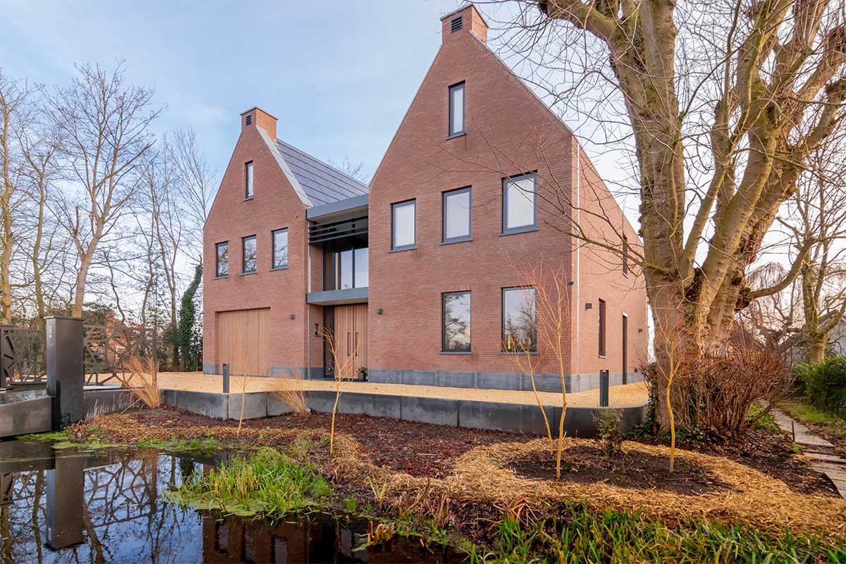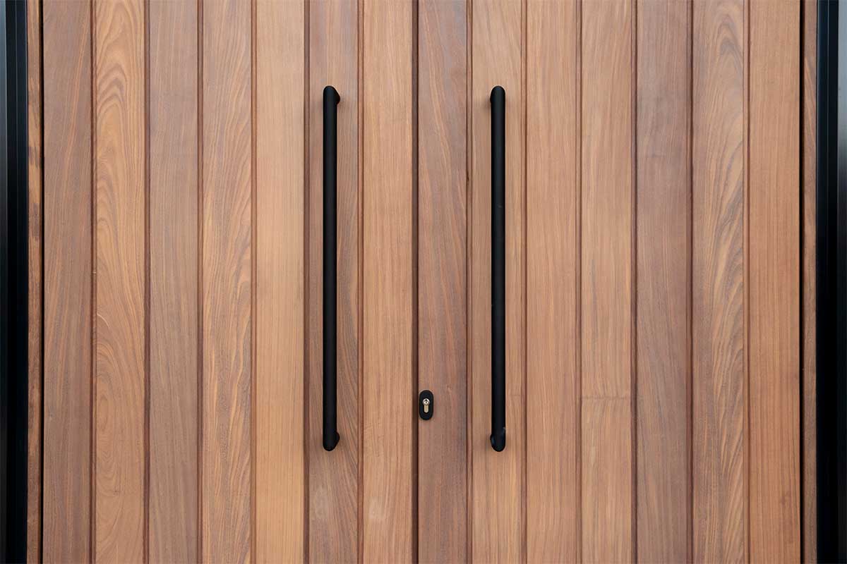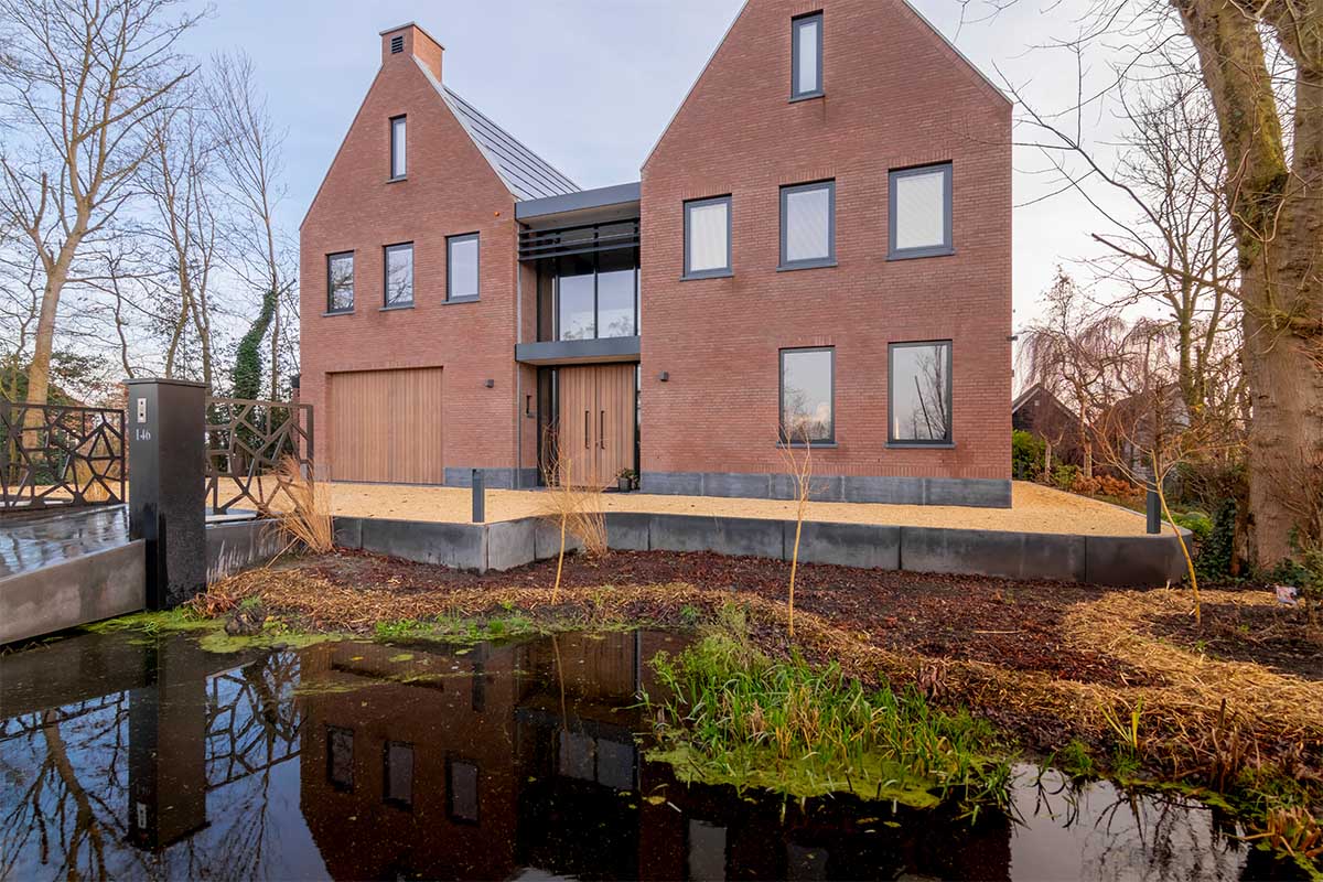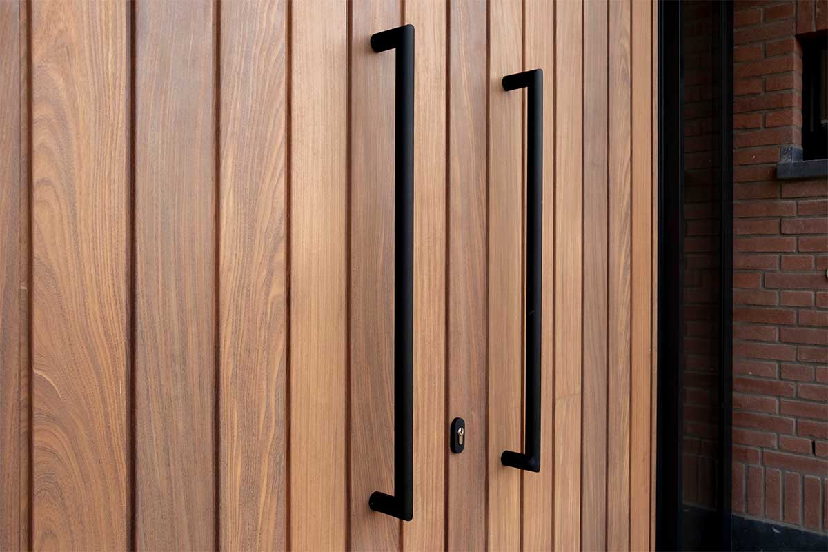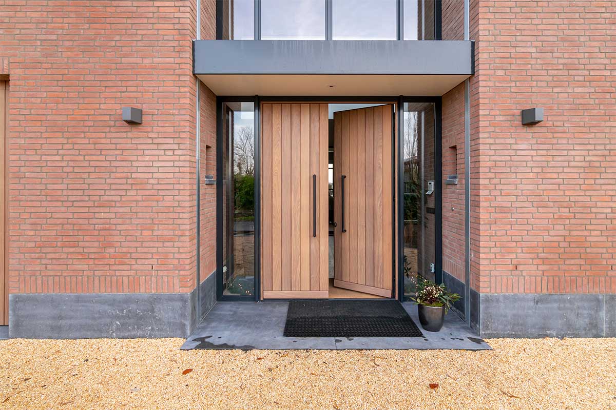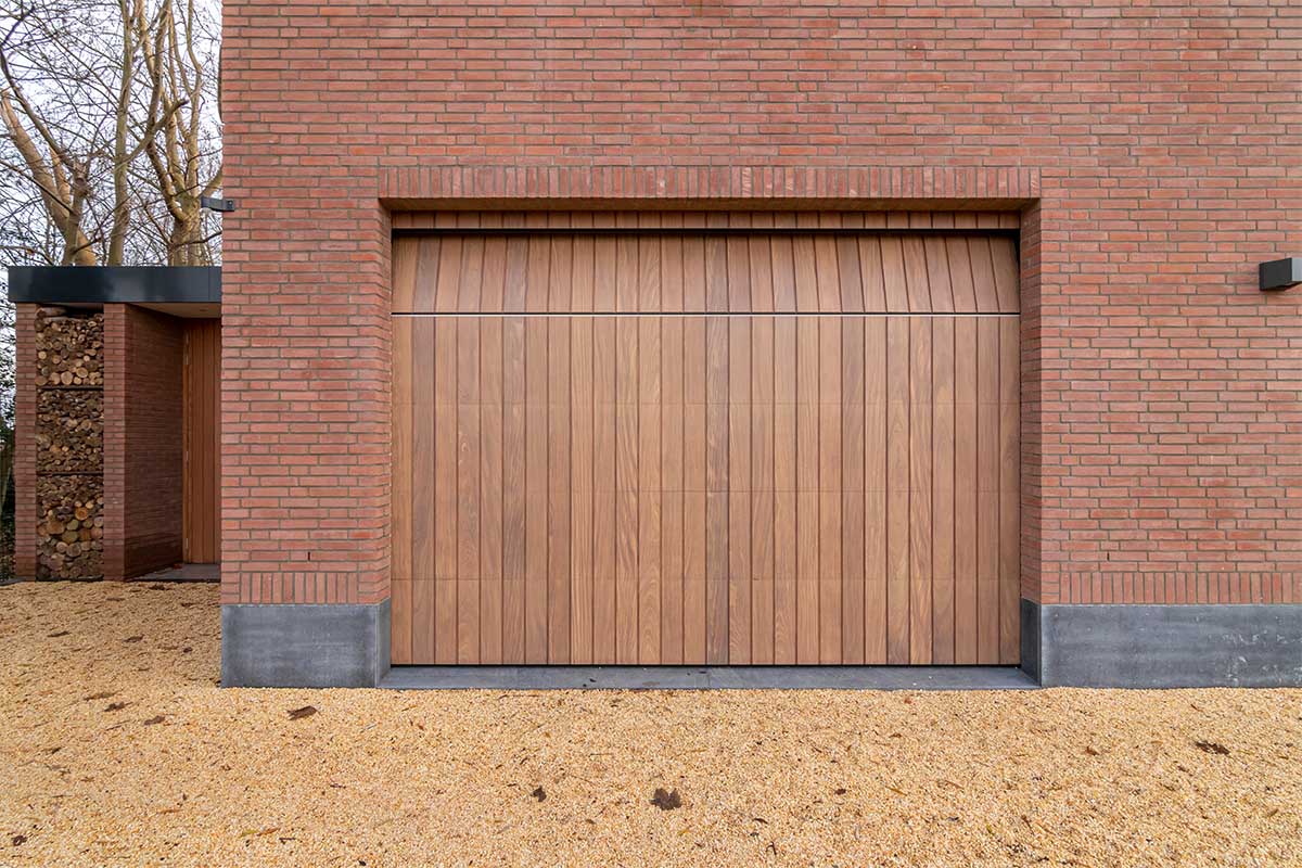 Bij de Vinkeveense plassen heeft Different Doors deze villa mogen voorzien van een houten garagedeur en dubbele houten voordeur in een aluminium kozijn. Beide deuren zijn volledig op maat gemaakt en voorzien van Afrormosia hout. Deze houtsoort kenmerkt zich door de mooie nerfstructuur. Het geeft deze villa een fraaie en natuurlijke afwerking. Daarnaast zijn ze perfect geïsoleerd en veilig. De houten voordeur is voorzien van een zeer veilige driepuntssluiting. De houten sectionaaldeur is te bedienen met een meegeleverde draadloze handzender.