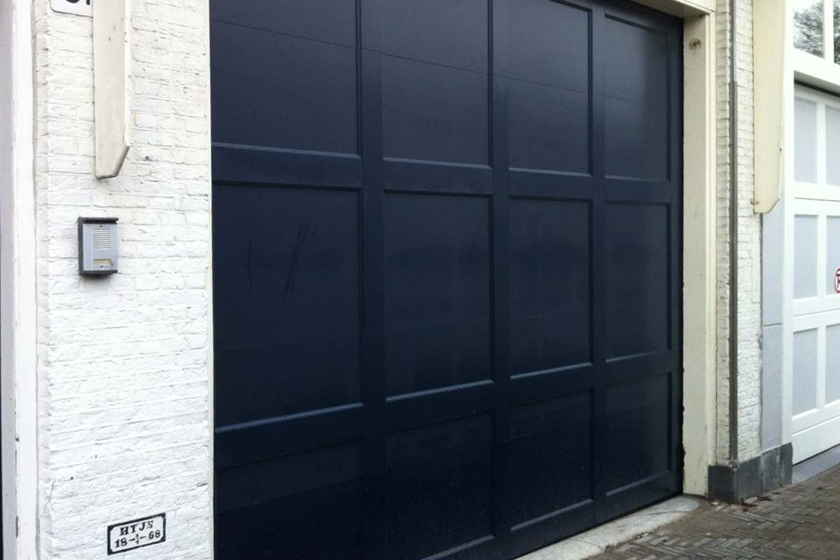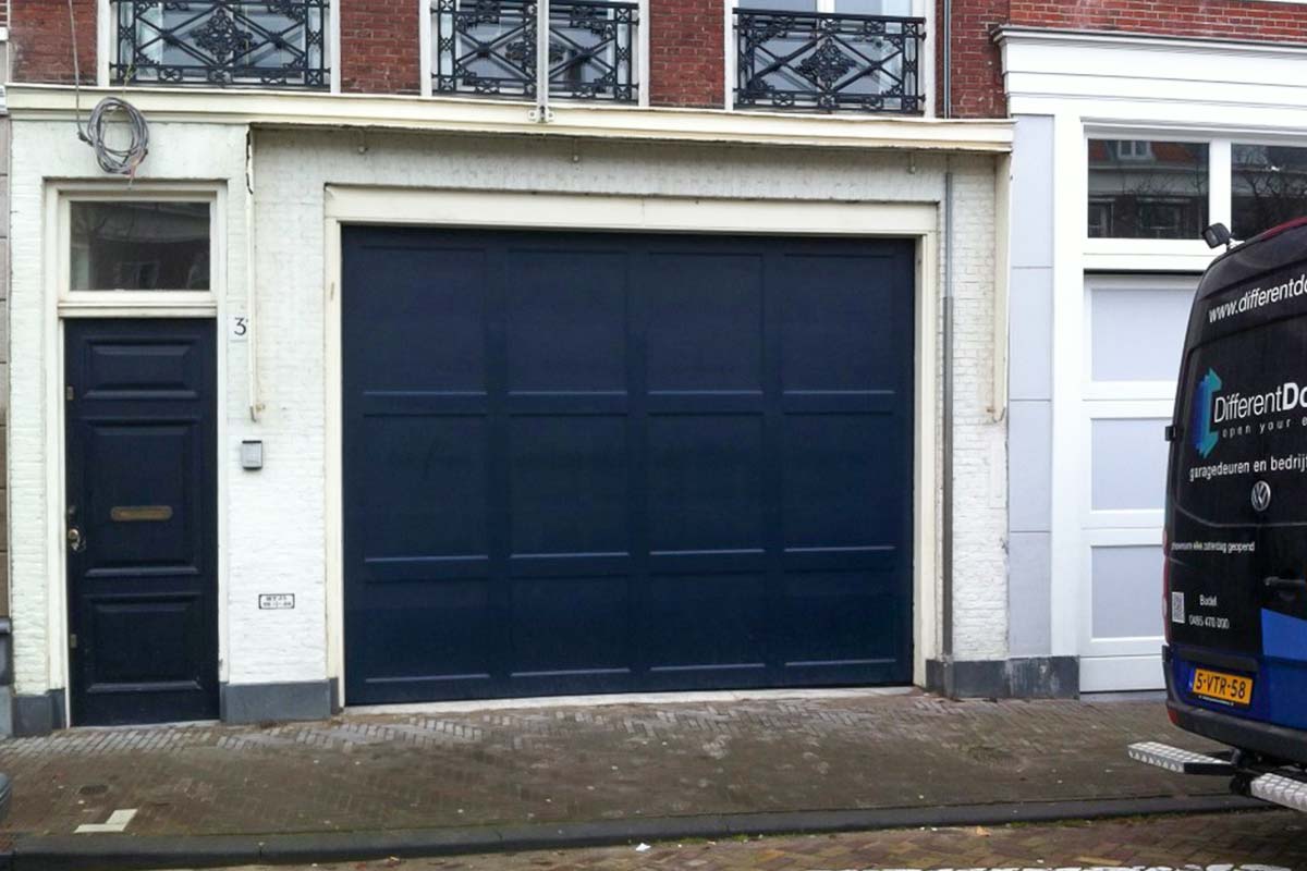 Different Doors monteerde in Den Haag een vlakke houten garagedeur. Deze houten sectionaaldeur is volledig volgens de ontwerpen van de desbetreffende architect uitgevoerd, dit zowel qua ontwerp als qua kleur die is toegepast.