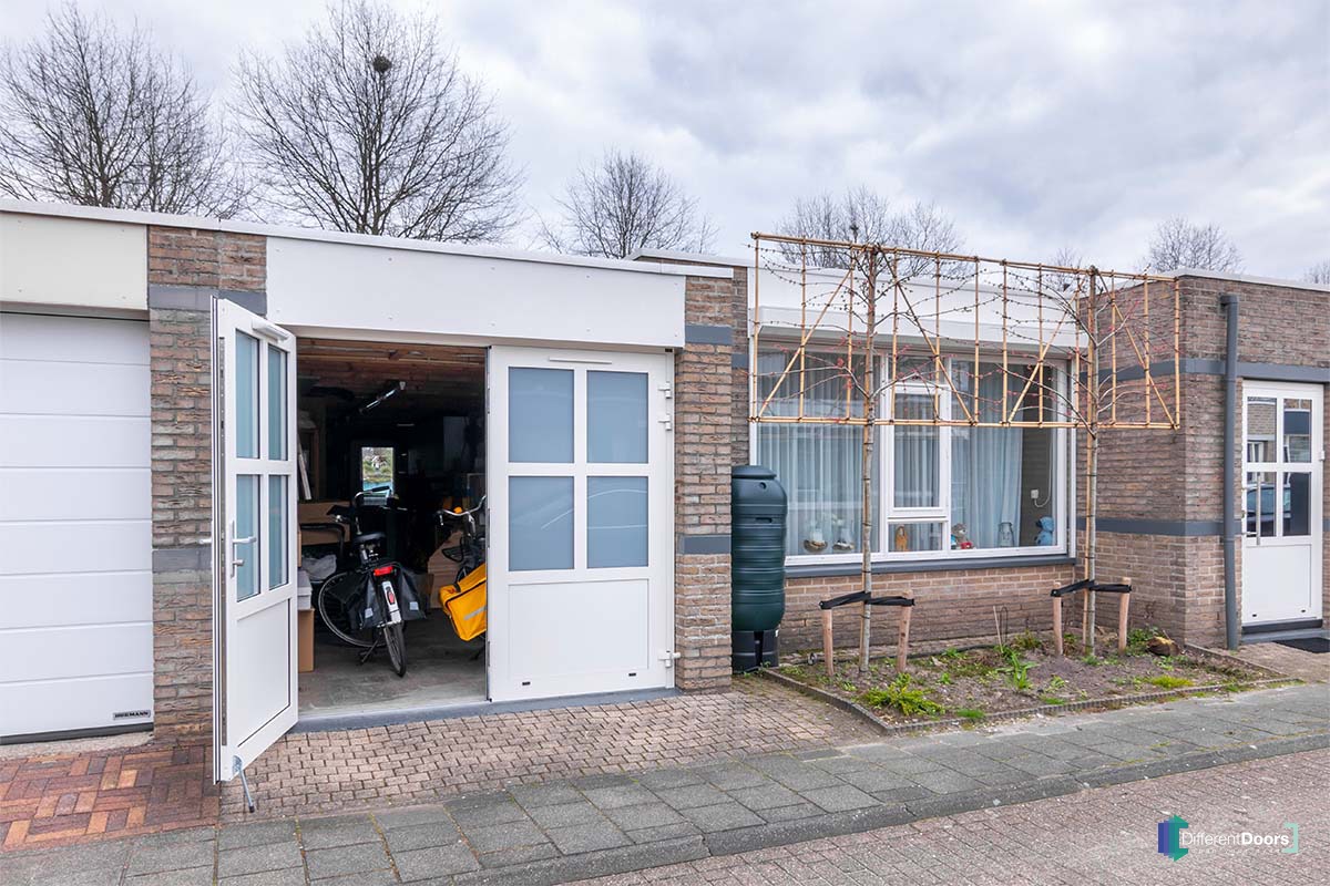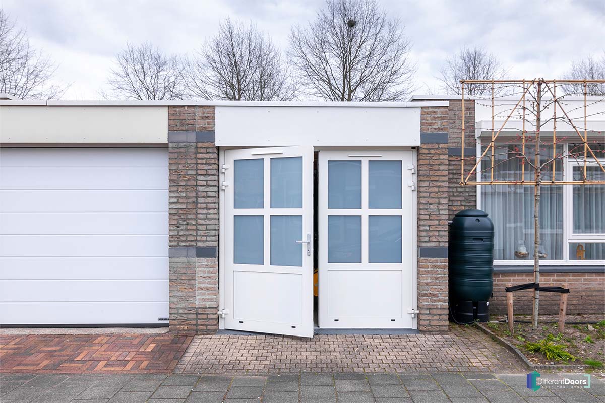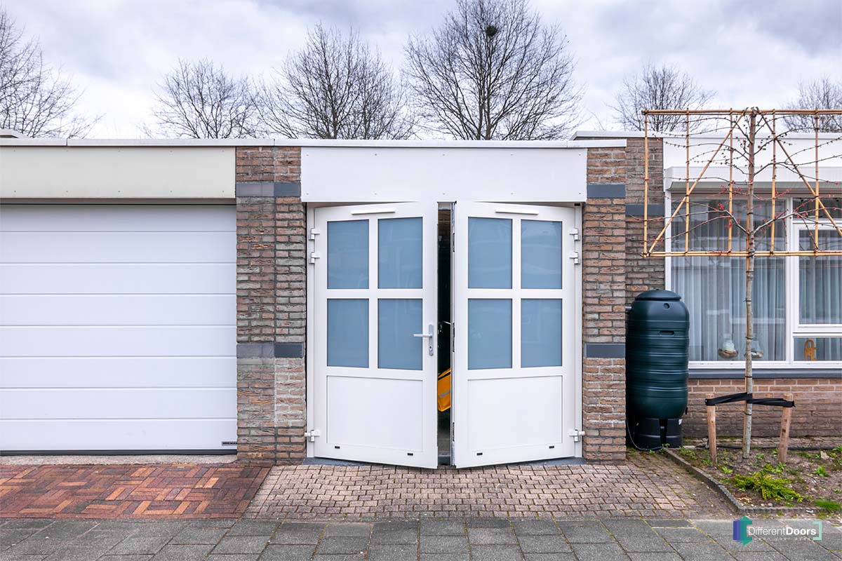 In het Brabantse Tilburg heeft Different Doors een bungalow woning mogen voorzien van nieuwe, witte openslaande garagedeuren en een nieuwe voordeur. Volledig naar wens van de klant zijn zowel de garagedeuren als voordeur voorzien van ramen. Voor de openslaande garagedeuren is er gebruik gemaakt van melkglas. Hierdoor kunnen voorbijgangers niet de garage inkijken, handig wanneer er kostbare spullen opgeborgen liggen in de garage.