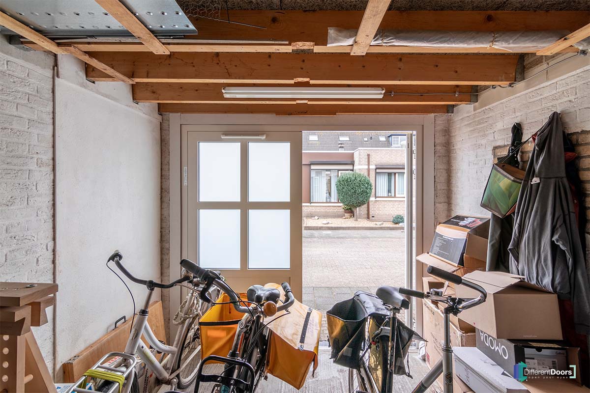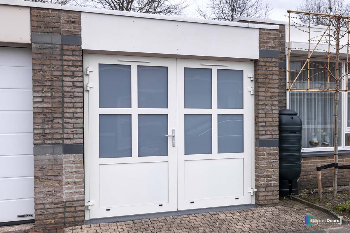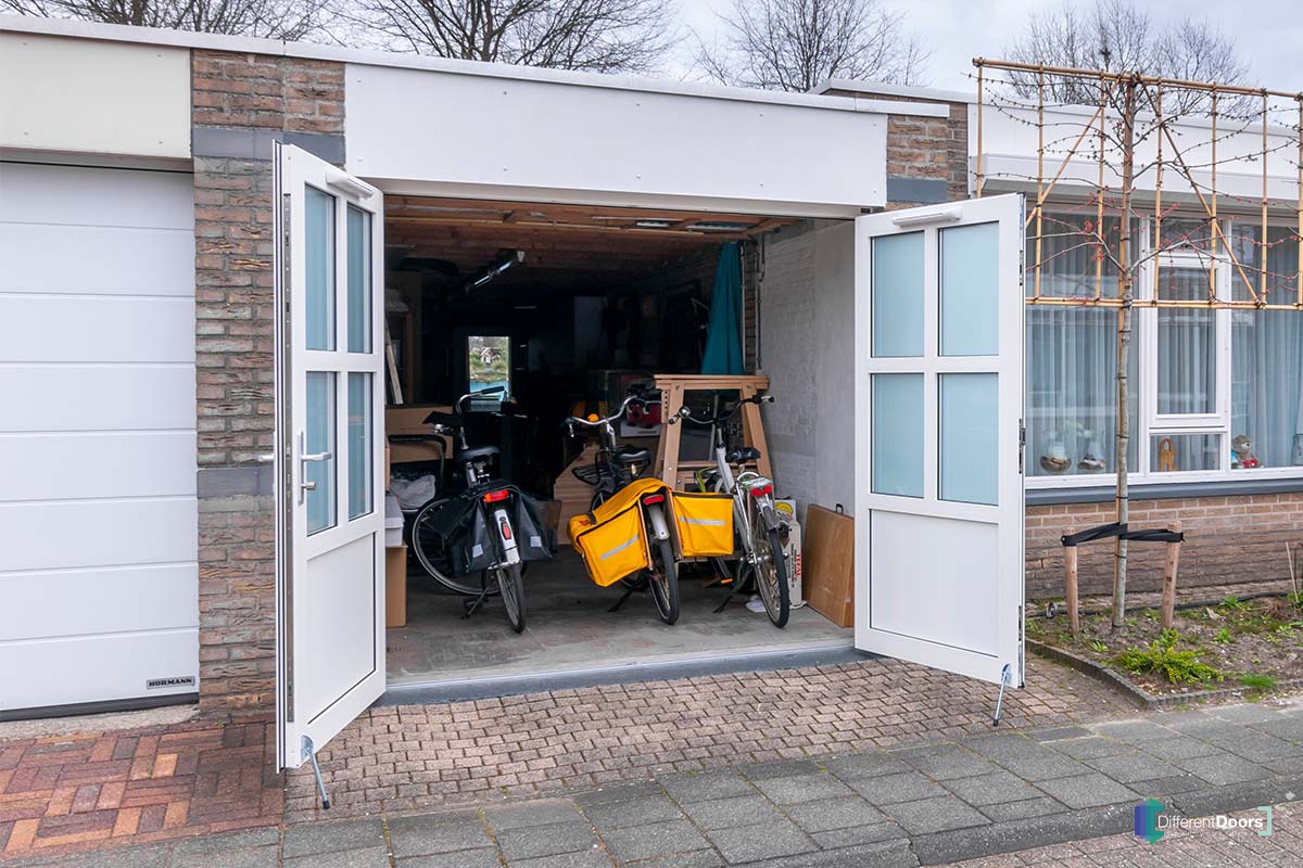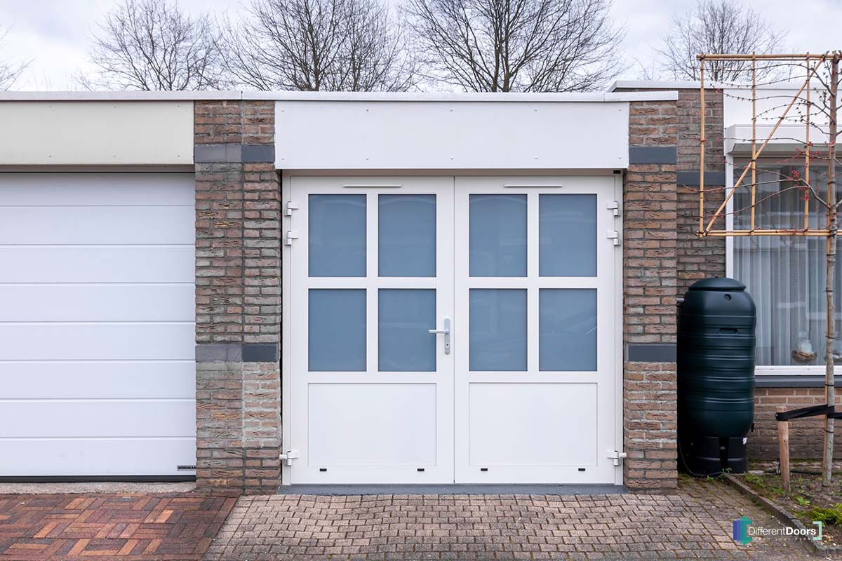 In het Brabantse Tilburg heeft Different Doors een bungalow woning mogen voorzien van nieuwe, witte openslaande garagedeuren en een nieuwe voordeur. Volledig naar wens van de klant zijn zowel de garagedeuren als voordeur voorzien van ramen. Voor de openslaande garagedeuren is er gebruik gemaakt van melkglas. Hierdoor kunnen voorbijgangers niet de garage inkijken, handig wanneer er kostbare spullen opgeborgen liggen in de garage.