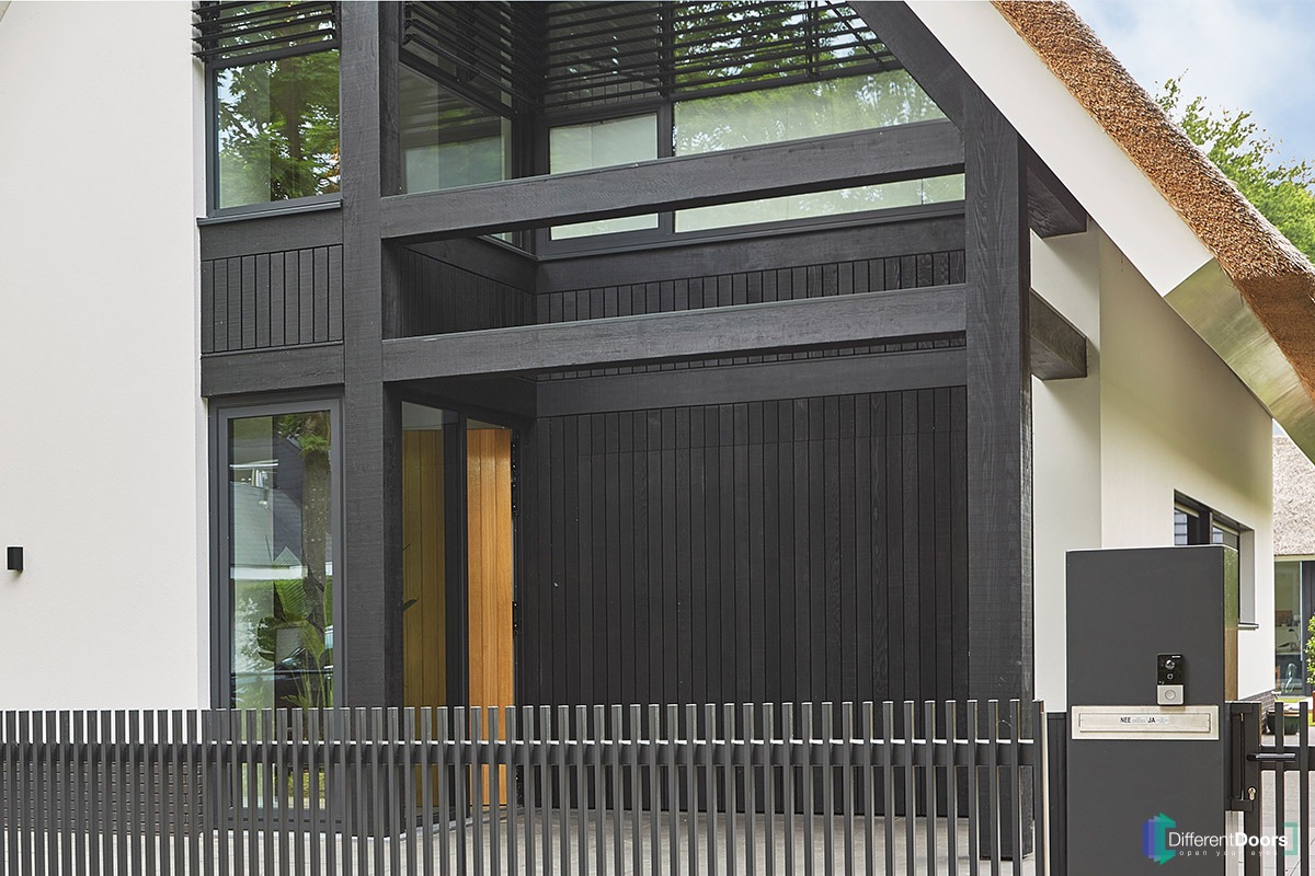In het mooie Brabant realiseerde Different Doors deze bijzondere zwarte houten garagedeur. De garagedeur is elektrisch en volledig weggewerkt in de gevel waardoor hij nagenoeg onzichtbaar is gemaakt. Deze modern landelijke villa bevat mooie contrasten met de rieten kap, de witte gevels en de zwarte garagedeur.